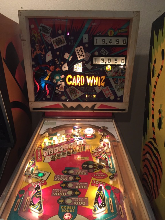 Card Whiz was produced by D. Gottieb & Co starting in July of 1976. This machine featured 2 flippers, 9 drop targets, 1 pop bumper, and 1 kick-out hole.
